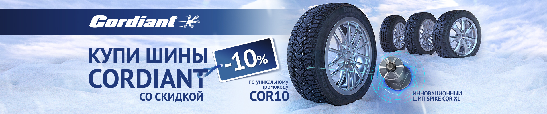 При заказе комплекта зимних шин Cordiant на сайте (комплектом считается единовременная покупка четырех шин одного типоразмера) в период с 1 октября 2019 года по 31 января 2020 года включительно воспользуйтесь уникальным промокодом COR10 и получите скидку 10 % при оплате покупки.